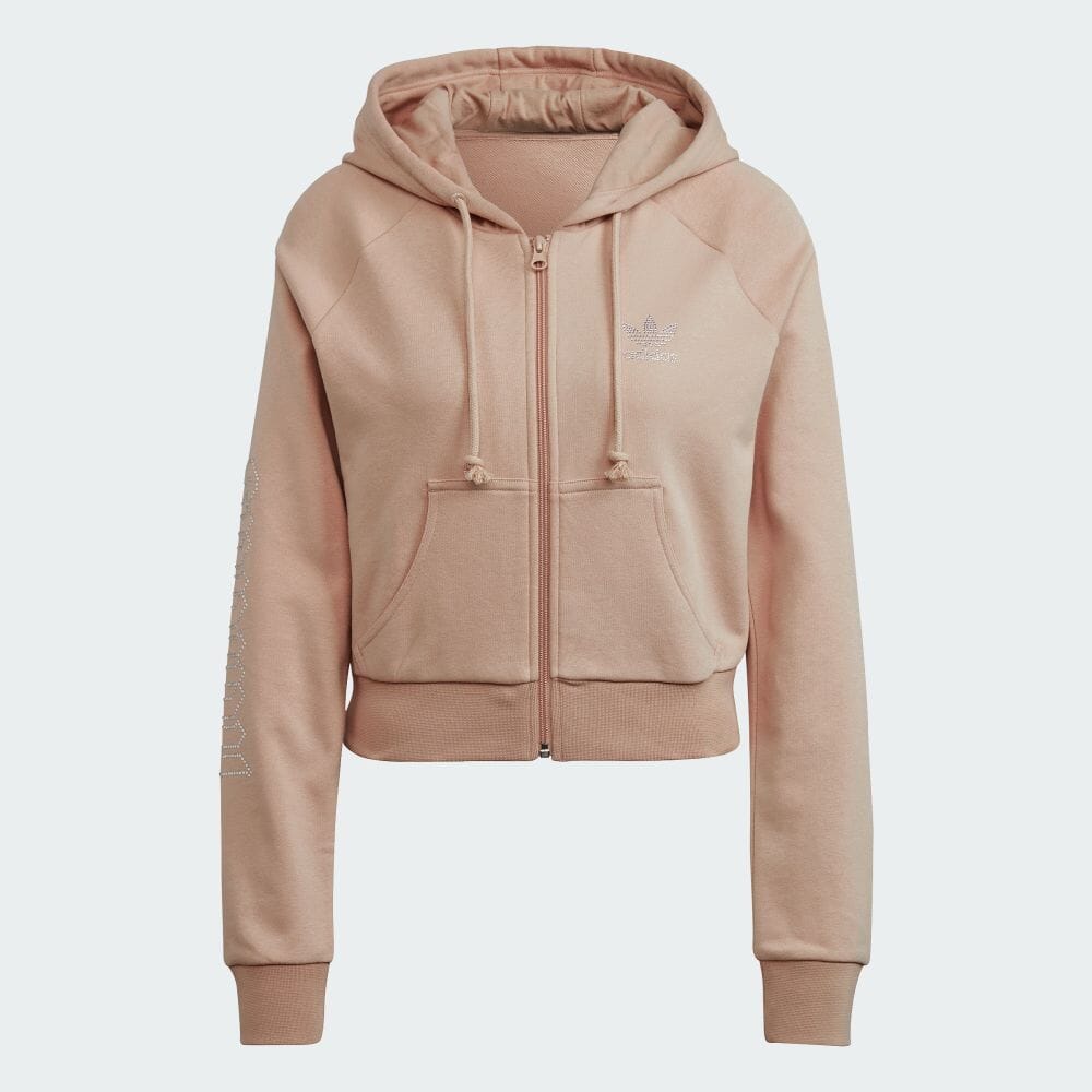 このパーカーには、袖とトレフォイルのロゴに光を反射するラインストーンがあしらわれている。